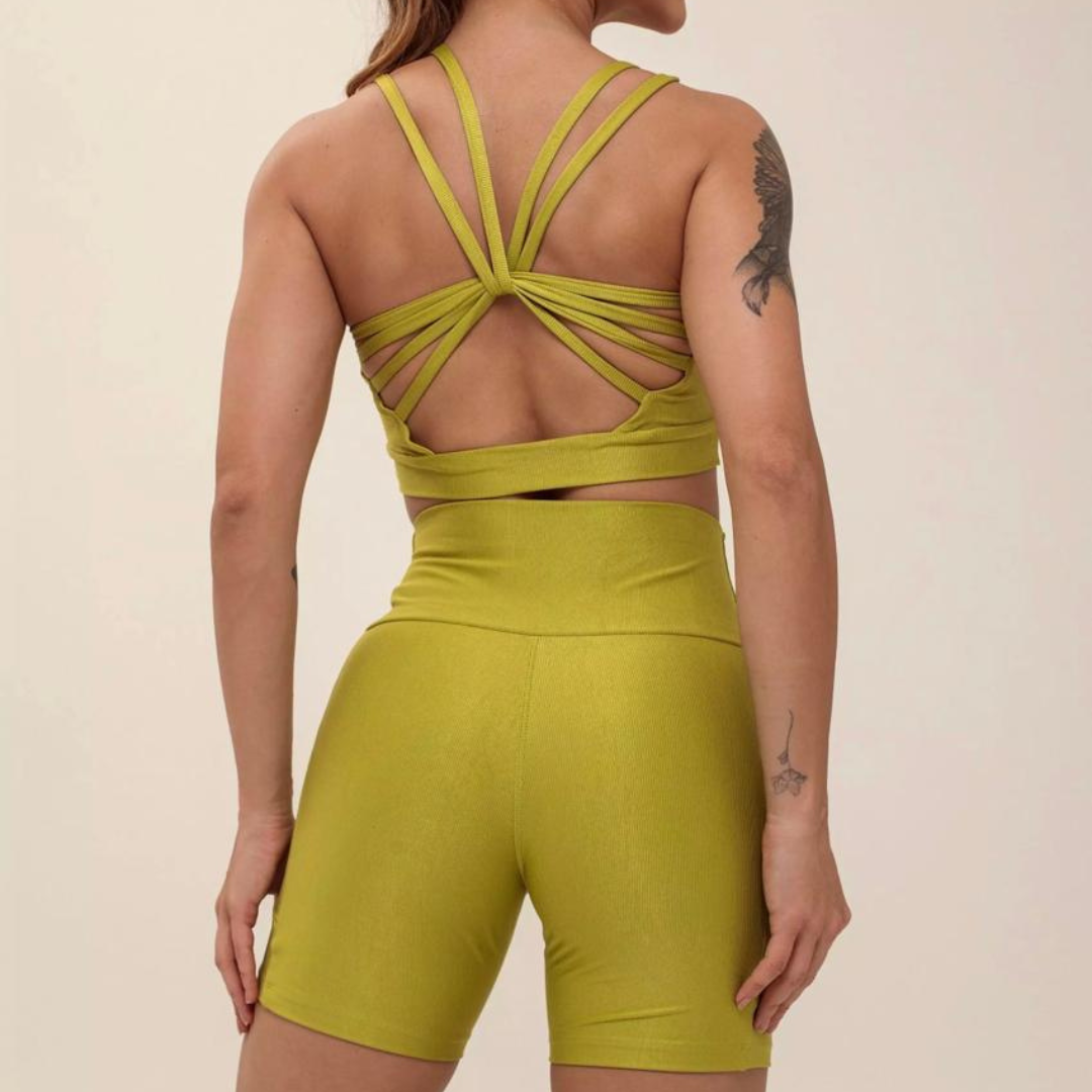 O Conjunto de Short Alyssa combina leveza, sustentação e um design marcante. O top possui múltiplas alças cruzadas nas costas, criando um efeito visual exclusivo e garantindo firmeza sem comprometer o conforto. O short oferece cós alto e reforçado, com bolsos laterais funcionais para trazer praticidade no dia a dia ou nos treinos. Feito em poliamida canelada, o conjunto veste com elasticidade, segurança e zero transparência.